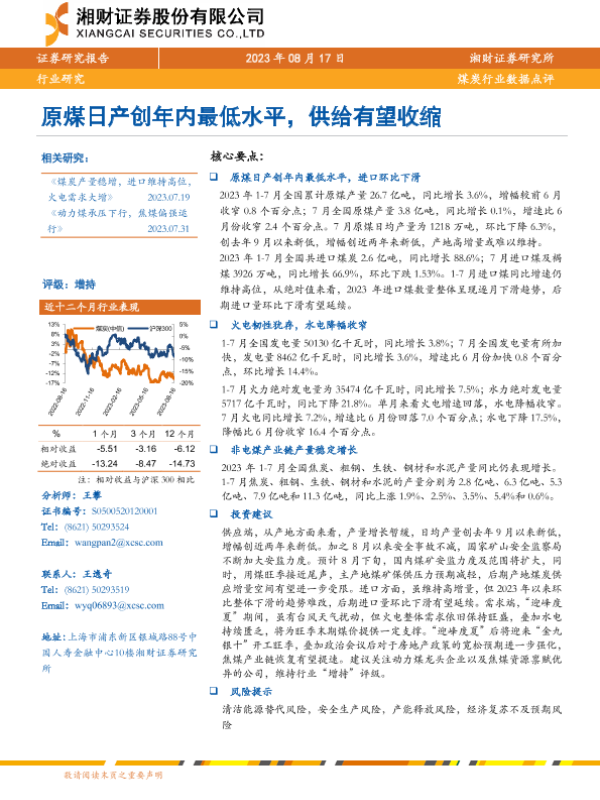 【湘财证券】【20230817】20230817-湘财证券-煤炭行业数据点评:原煤日产创年内最低水平,供给有望收缩-10页 行业研究