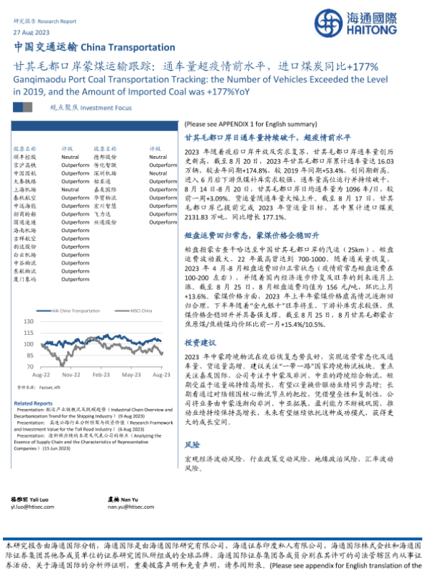 【海通国际】【20230827】甘其毛都口岸蒙煤运输跟踪:通车量超疫情前水平,进口煤炭同比+177%-11页 行业研究