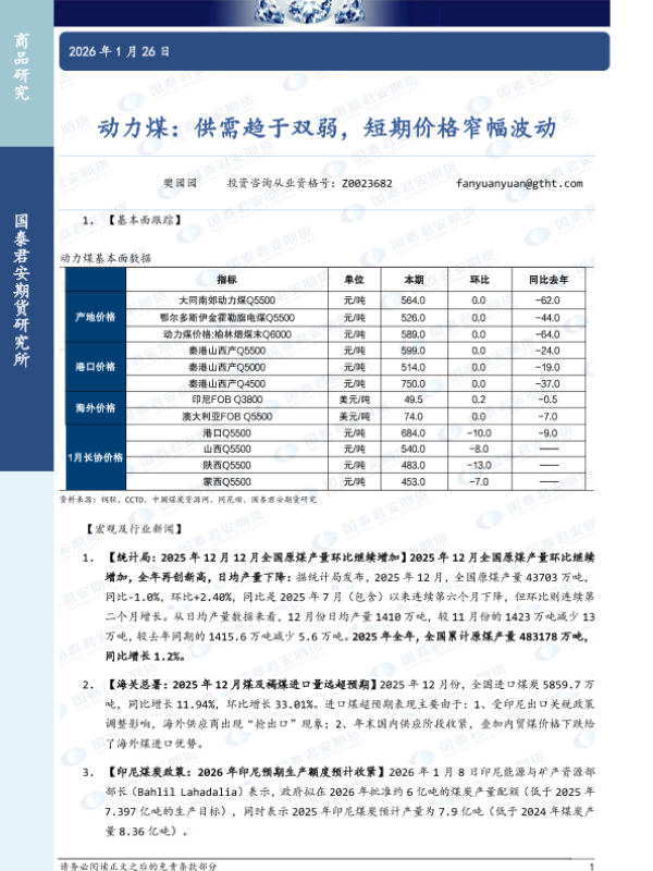 【国泰君安期货】【202601】动力煤:供需趋于双弱,短期价格窄幅波动-2页 证券期货研究报告