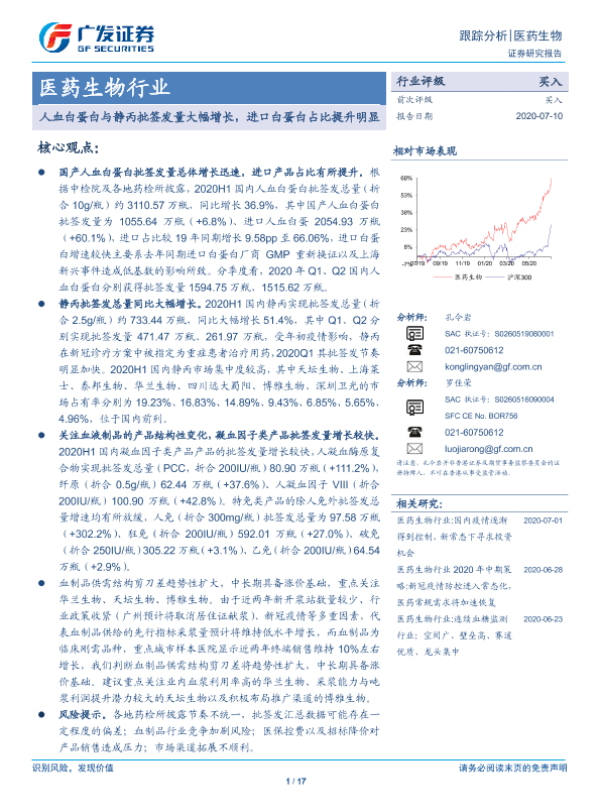 【广发证券】【20200710】人血白蛋白与静丙批签发量大幅增长,进口白蛋白占比提升明显-17页 行业研究
