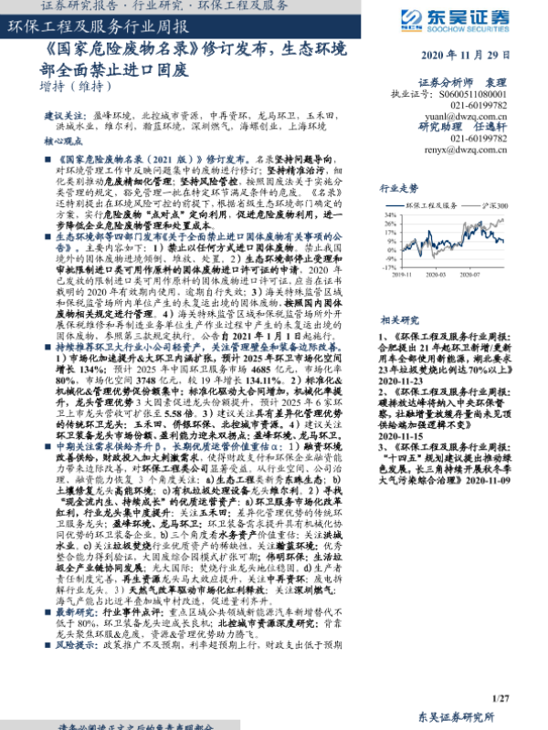 【东吴证券】【20201129】环保工程及服务行业周报:《国家危险废物名录》修订发布,生态环境部全面禁止进口固废-27页 行业研究