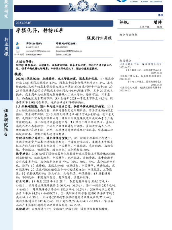【国泰君安证券】【20230503】20230503-国泰君安-煤炭行业周报:季报优异,静待旺季-24页 行业研究