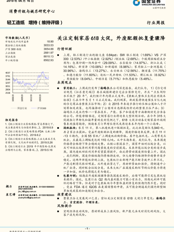 【国金证券】【20190616】20190616-国金证券-轻工造纸行业周报:关注定制家居618大促,外废配额批复量骤降-28页 行业研究