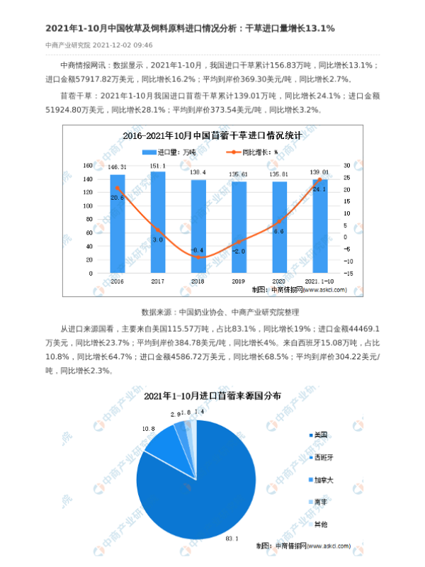 【中商产业研究院】【2021】2021年1-10月中国牧草及饲料原料进口情况分析-2页 行业研究