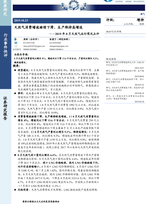 【国泰君安证券】【20191023】2019年8月天然气运行简况点评:天然气消费增速继续下滑,生产维持高增速-7页 行业研究