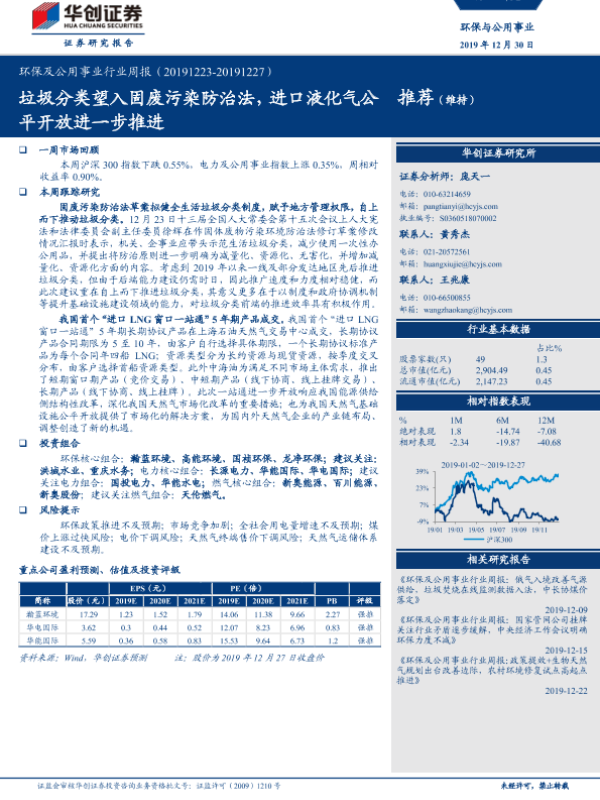 【华创证券】【20191230】环保及公用事业行业周报-31页 行业研究
