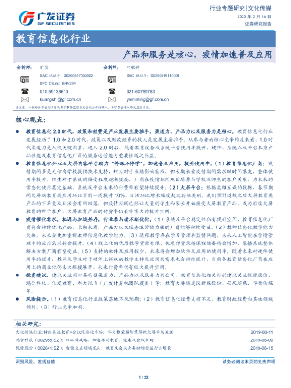 【广发证券】【20200216】教育信息化行业:产品和服务是核心,疫情加速普及应用-22页 行业研究