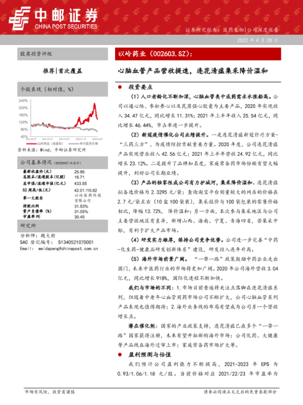 【中邮证券】【20220429】以岭药业-002603.SZ-心脑血管产品营收提速,连花清瘟集采降价温和-23页 行业研究