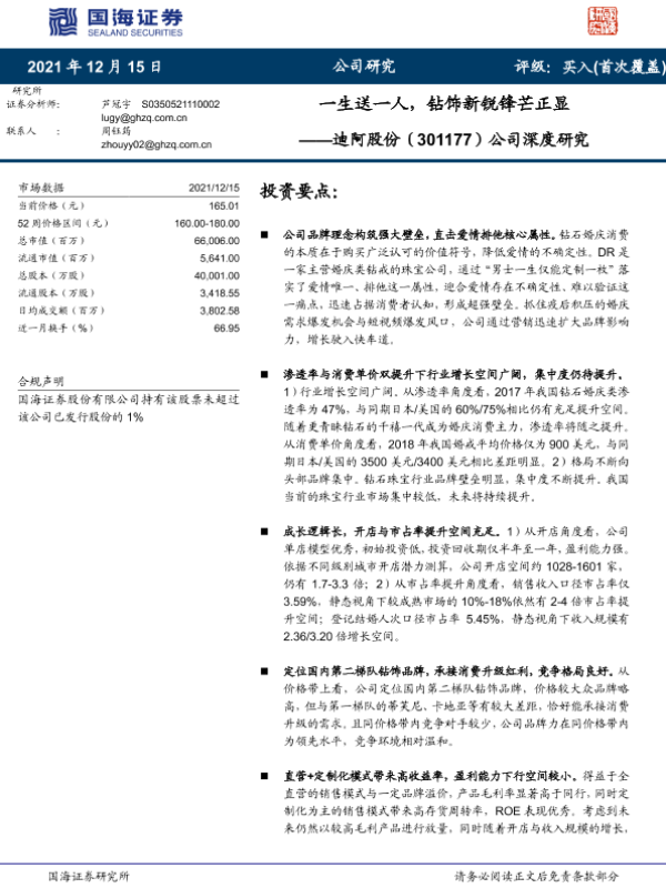 【国海证券】【20211215】一生送一人,钻饰新锐锋芒正显——迪阿股份(301177)公司深度研究-30页 行业研究