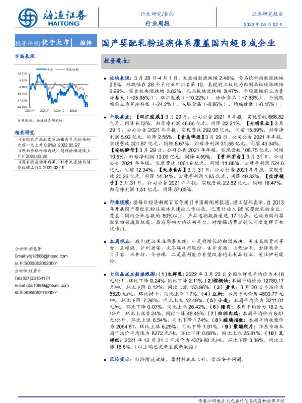 【海通证券】【20220402】20220402-海通证券-食品行业周报:国产婴配乳粉追溯体系覆盖国内超8成企业-9页 行业研究