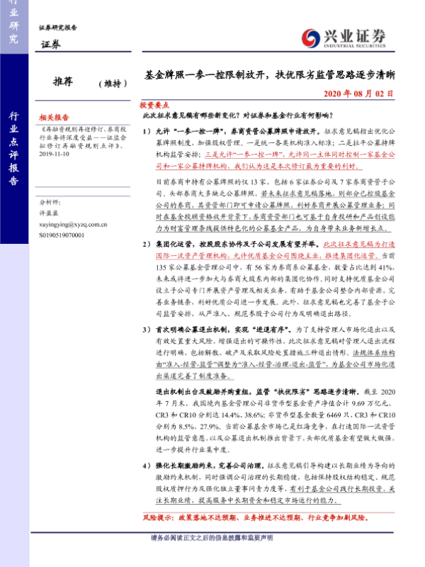 【兴业证券】【20200802】基金牌照一参一控限制放开,扶优限劣监管思路逐步清晰-5页 行业研究