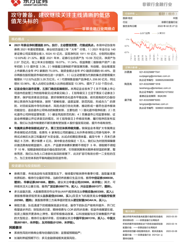 【东方证券】【20220227】非银金融行业周观点:攻守兼备,建议继续关注主线清晰的低估值龙头标的-15页 行业研究
