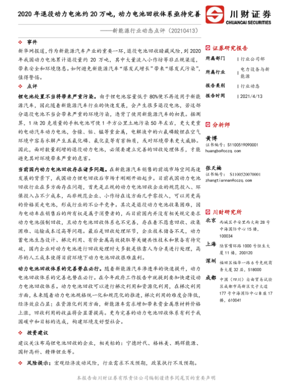 【川财证券】【20210413】2020年退役动力电池约20万吨,动力电池回收体系亟待完善-2页 证券期货研究报告