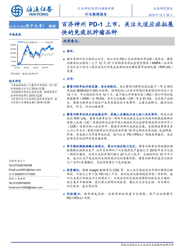 【海通证券】【20191230】百济神州PD-1上市,关注大适应症拓展快的免疫抗肿瘤品种-2页 行业研究