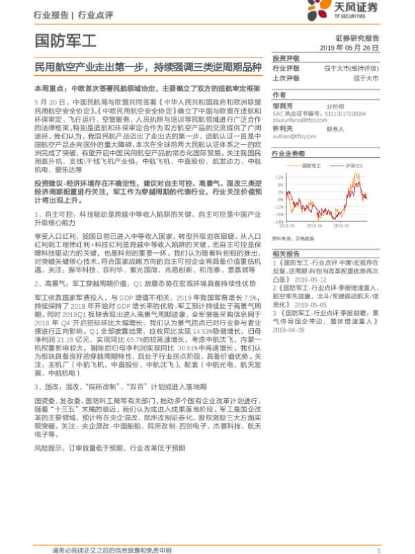 【天风证券】【20190526】国防军工行业点评:民用航空产业走出第一步,持续强调三类逆周期品种-3页 行业研究