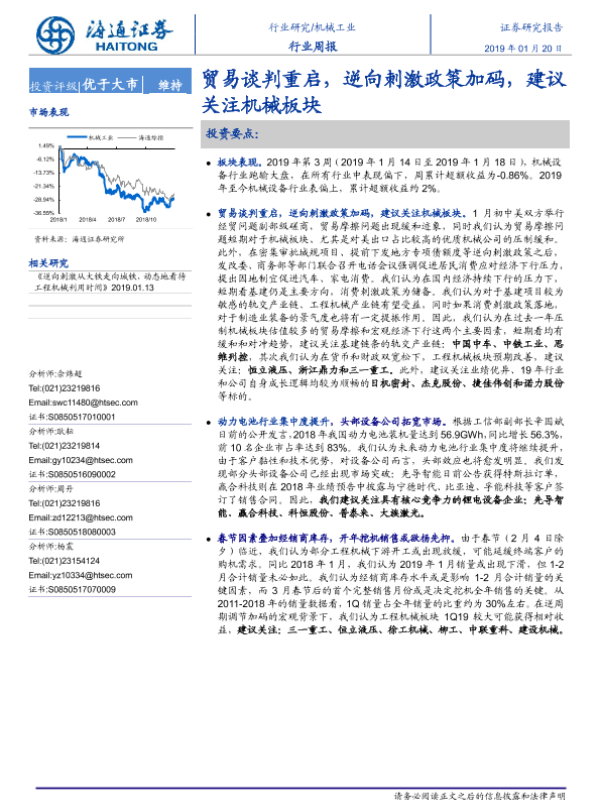 【海通证券】【20190120】20190120-海通证券-机械工业行业周报 贸易谈判重启,逆向刺激政策加码,建议关注机械板块-16页 行业研究