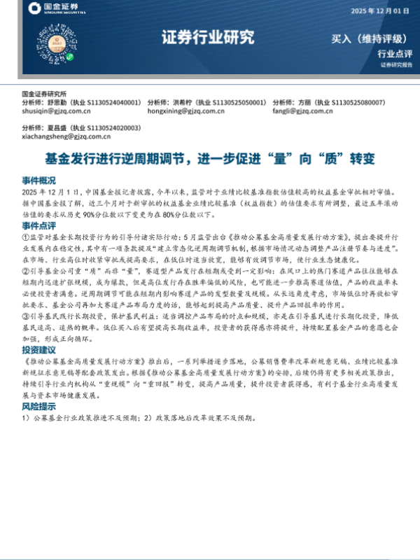 【国金证券】【202512】基金发行进行逆周期调节,进一步促进“量”向“质”车转变-3页 证券期货研究报告