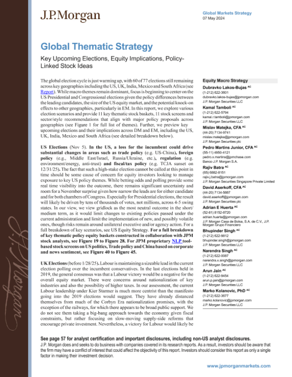 【J.P. Morgan】【20240507】JPMorgan-Global Thematic Strategy Key Upcoming Elections, Equity Implications, Policy-Linked Stock Ideas-61页 行业研究