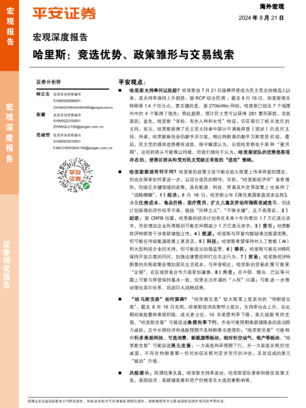 【平安证券】【20240821】哈里斯:竞选优势、政策雏形与交易线索-17页 行业研究
