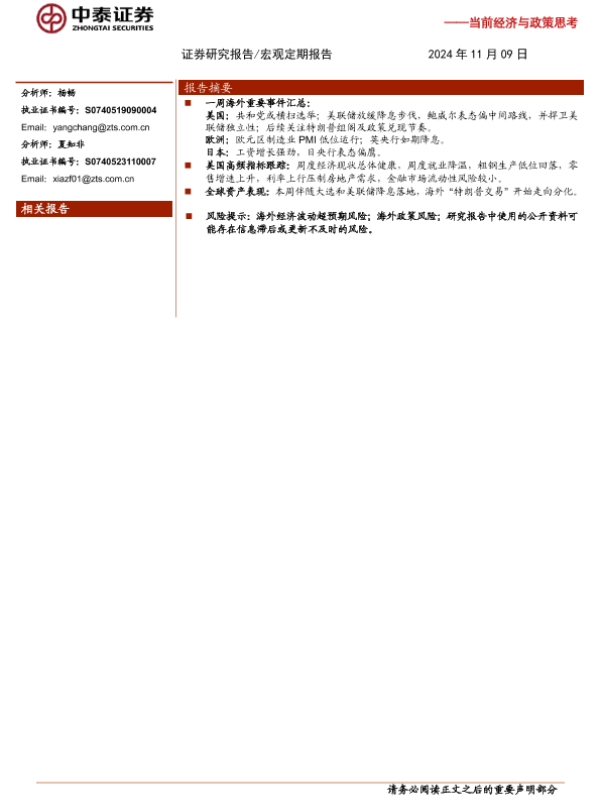 【中泰证券】【20241109】当前经济与政策思考:鲍威尔捍卫美联储独立性-12页 宏观策略