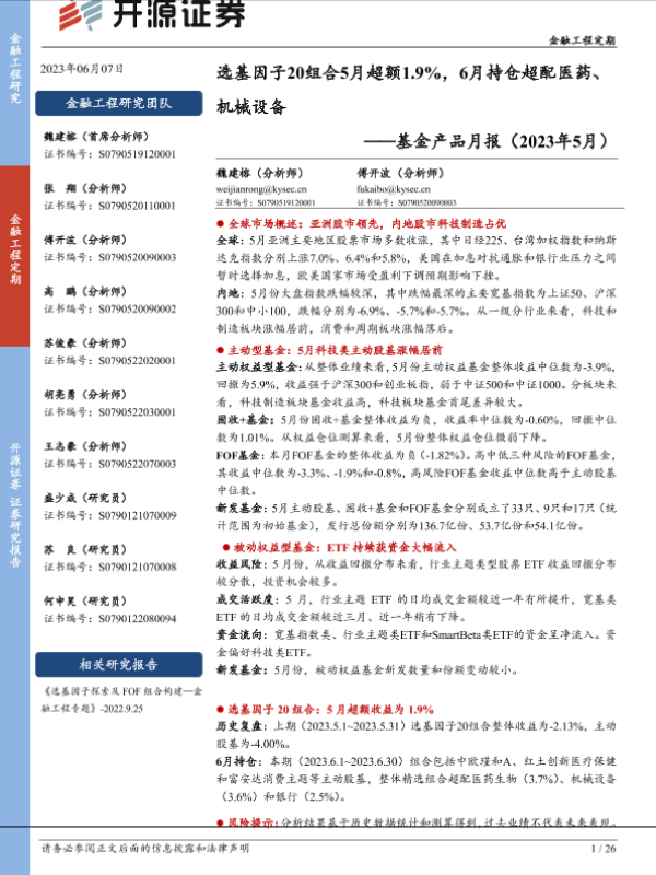 【开源证券】【20230607】基金产品月报(2023年5月):选基因子20组合5月超额1.9%,6月持仓超配医药、机械设备-26页 行业研究
