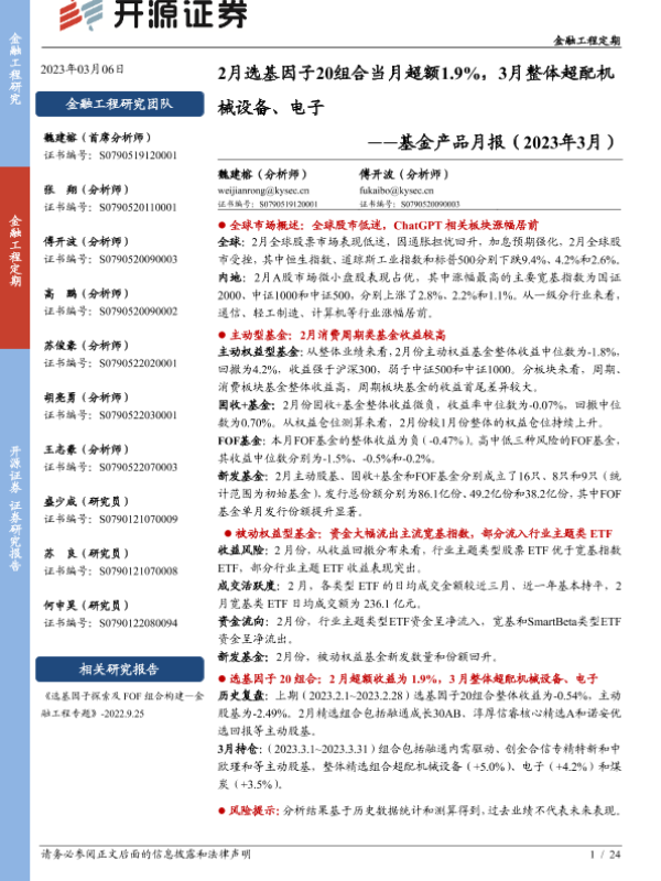 【开源证券】【20230306】基金产品月报(2023年3月):2月选基因子20组合当月超额1.9%,3月整体超配机械设备、电子-24页 行业研究