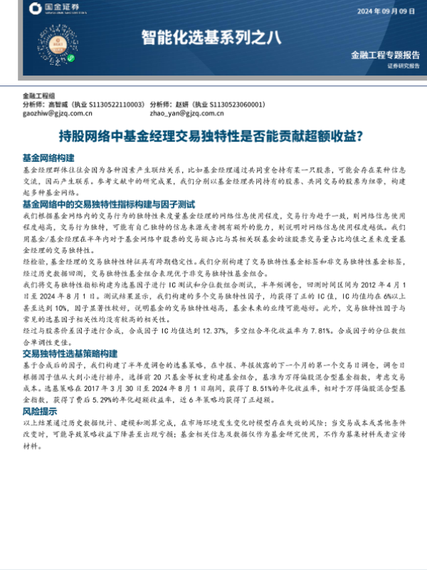 【国金证券】【20240909】智能化选基系列之八:持股网络中基金经理交易独特性是否能贡献超额收益?-16页 行业研究