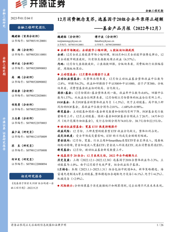 【开源证券】【20230104】基金产品月报(2022年12月):12月消费概念复苏,选基因子20组合全年录得正超额-26页 行业研究