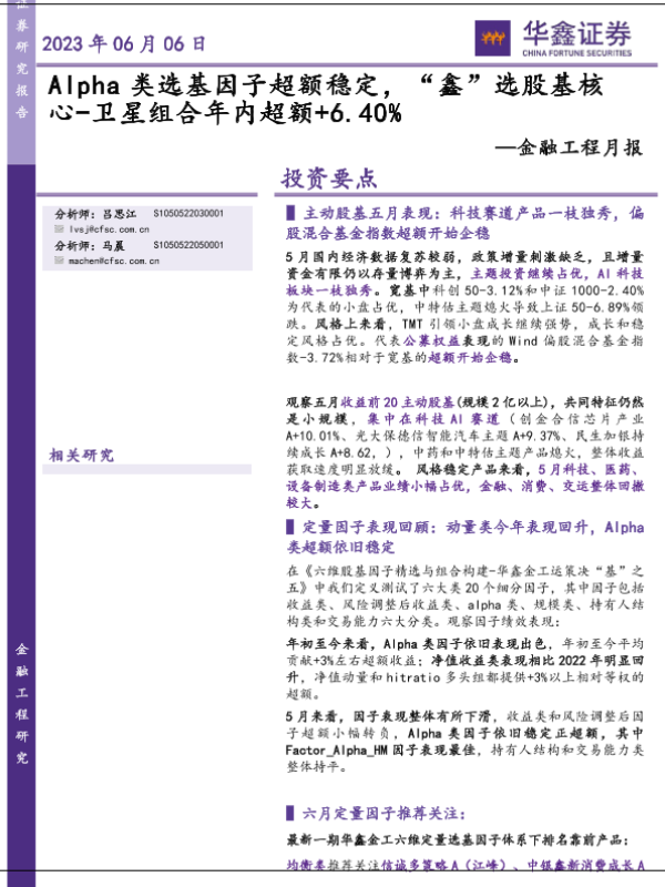 【华鑫证券】【20230606】金融工程月报:Alpha类选基因子超额稳定,“鑫”选股基核心_卫星组合年内超额+6.40%-16页 行业研究