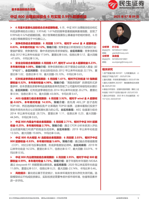 【民生证券】【20250708】基本面选股组合月报:中证800治理能效组合6月实现0.99%超额收益-22页 证券期货研究报告