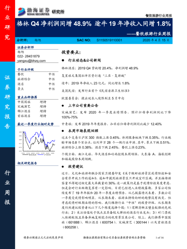 【渤海证券】【20200415】餐饮旅游行业周报:格林Q4净利润同增48.9% 途牛19年净收入同增1.8%-16页 行业研究