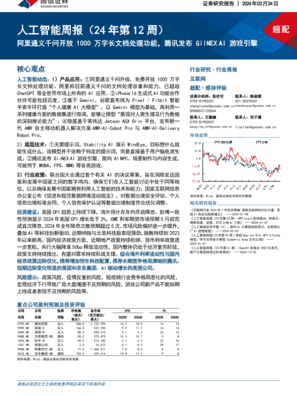 【国信证券】【20240324】20240324-国信证券-人工智能周报(24年第12周):阿里通义千问开放1000万字长文档处理功能,腾讯发布GiiNEX AI游戏引擎-12页 行业研究