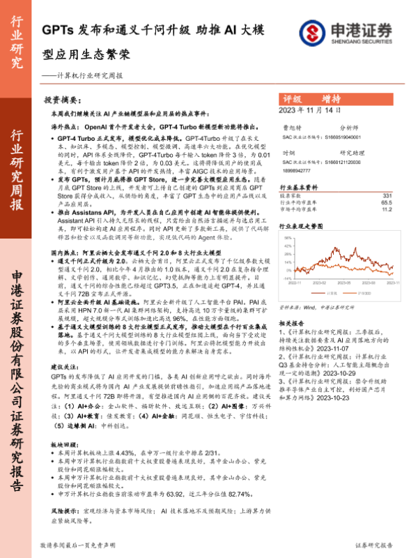 【申港证券】【20231114】20231114-申港证券-计算机行业研究周报:GPTs发布和通义千问升级 助推AI大模型应用生态繁荣-10页 行业研究