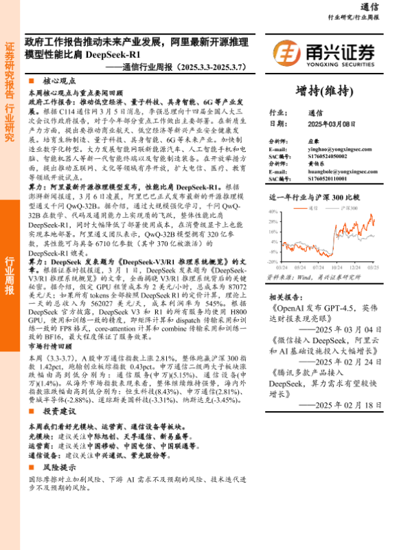 【甬兴证券】【20250313】通信行业周报:政府工作报告推动未来产业发展,阿里最新开源推理模型性能比肩DeepSeek-R1-12页 行业研究