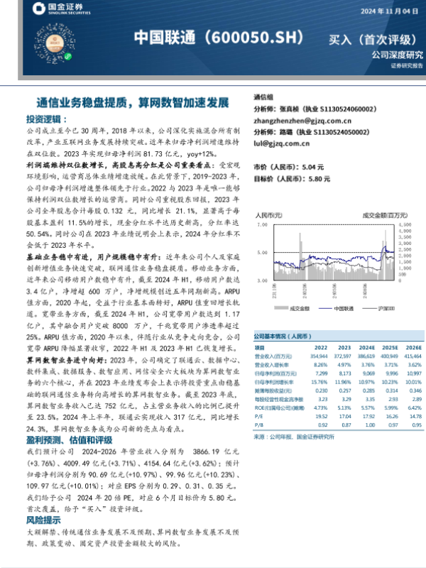 【国金证券】【20241104】中国联通(600050)通信业务稳盘提质,算网数智加速发展-28页 行业研究