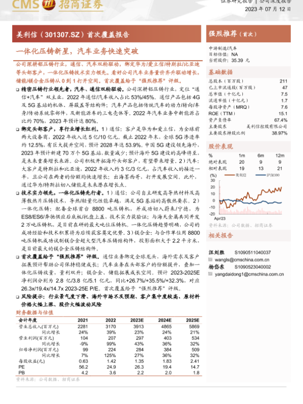 【海通证券】【20230712】20230712-招商证券-美利信-301307.SZ-首次覆盖报告:一体化压铸新星,汽车业务快速突破-24页 行业研究
