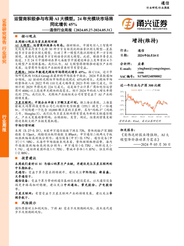 【甬兴证券】【20240604】20240604-甬兴证券-通信行业周报:运营商积极参与布局AI大模型,24年光模块市场将同比增长45%-14页 行业研究