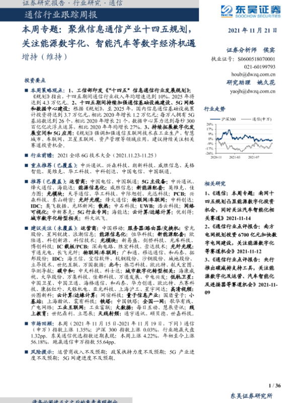 【东吴证券】【20211121】通信行业跟踪周报:聚焦信息通信产业十四五规划,关注能源数字化、智能汽车等数字经济机遇-36页 行业研究