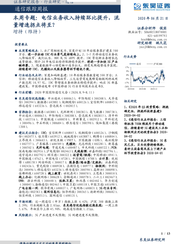 【东吴证券】【20200621】20200621-东吴证券-通信跟踪周报:本周专题:电信业务收入持续环比提升,流量增速拐点将至?-13页 行业研究