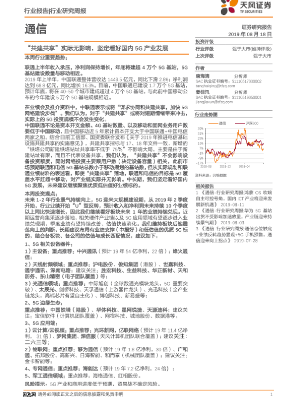 【天风证券】【20190818】20190818-天风证券-通信行业研究周报:“共建共享”实际无影响,坚定看好国内5G产业发展-18页 行业研究
