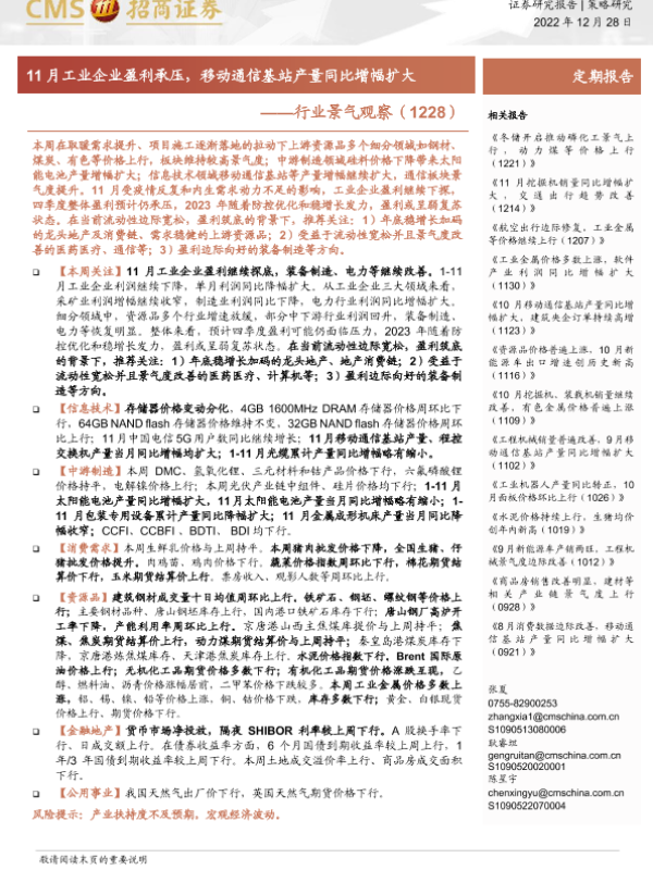 【海通证券】【20221228】行业景气观察:11月工业企业盈利承压,移动通信基站产量同比增幅扩大-30页 行业研究