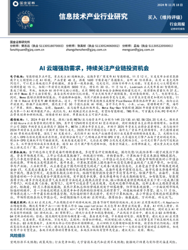 【国金证券】【20241118】信息技术产业行业研究:AI云端强劲需求,持续关注产业链投资机会-21页 行业研究