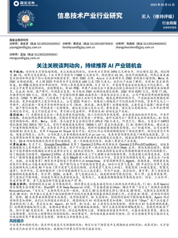【国金证券】【20250511】信息技术产业行业研究:关注关税谈判动向,持续推荐AI产业链机会-19页 行业研究