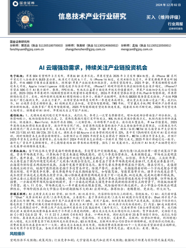 【国金证券】【20241202】信息技术产业行业研究:AI云端强劲需求,持续关注产业链投资机会-22页 行业研究