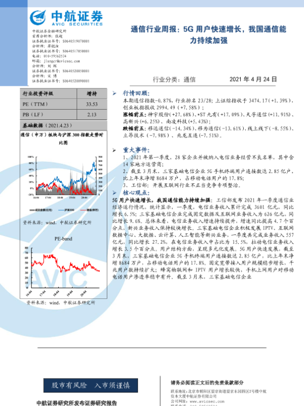 【中航证券】【20210424】通信行业周报:5G用户快速增长,我国通信能力持续加强-3页 证券期货研究报告