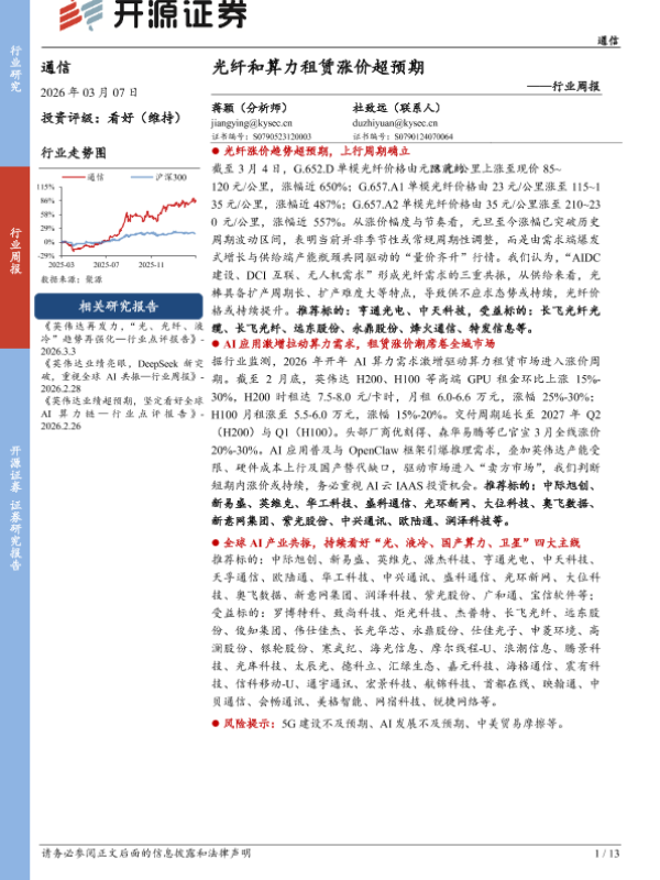 【开源证券】【202603】光纤和算力租赁涨价超预期-13页 证券期货研究报告