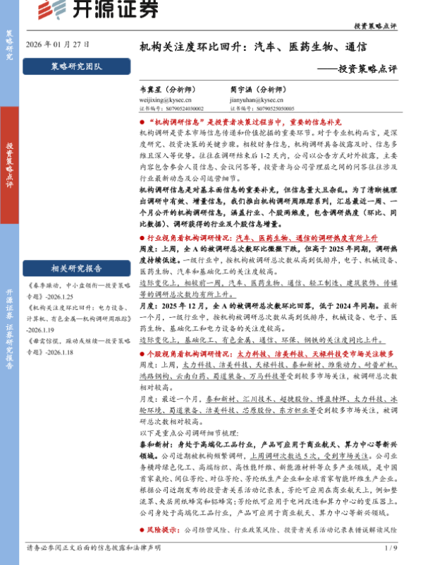 【开源证券】【202601】机构关注度环比回升:汽车、医药生物、通信——投资策略点评-9页 证券期货研究报告