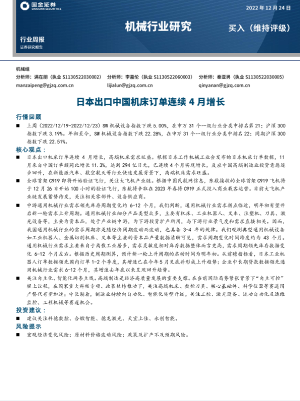 【国金证券】【20221224】20221224-国金证券-机械行业研究:日本出口中国机床订单连续4月增长-16页 行业研究