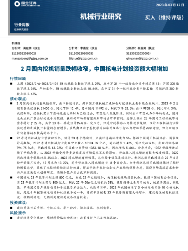 【国金证券】【20230312】20230312-国金证券-机械行业研究:2月国内挖机销量跌幅收窄,中国核电计划投资额大幅增加-16页 行业研究