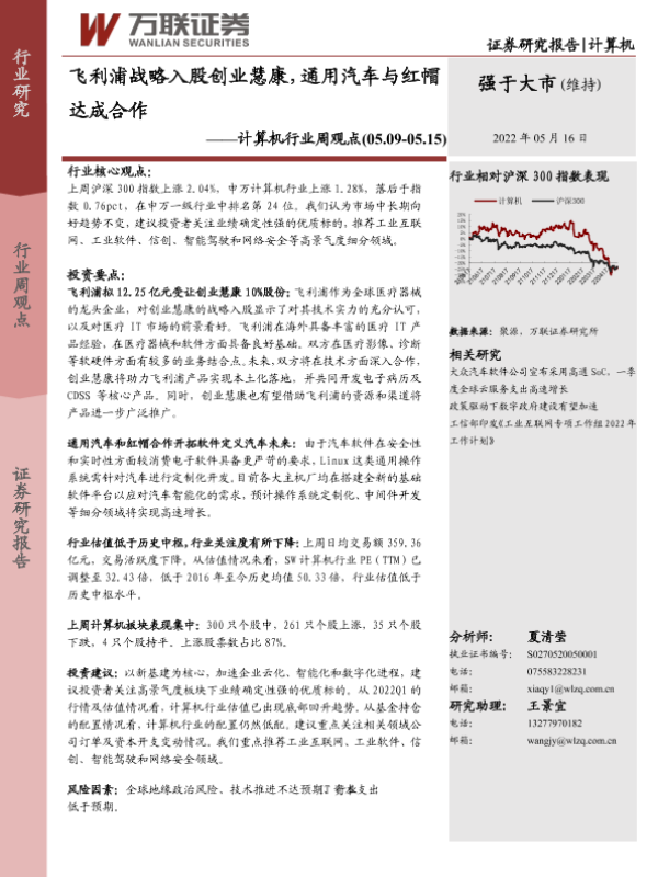 【万联证券】【20220516】20220516-万联证券-计算机行业周观点:飞利浦战略入股创业慧康,通用汽车与红帽达成合作-11页 行业研究